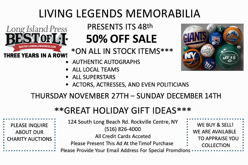Living Legends Memorabilia & Collectibles, Inc. is the number one seller of sports memorabilia, Hollywood memorabilia, and political memorabilia in Long Island, New York and the surrounding areas. We have high-end memorabilia that you will love. We have everything you could think of and more. Once you take a step into our authentic shop, you are going to see a wide range of memorabilia, including autographs and signed memorabilia. Some of it is from movies, TV shows, sporting events, and more. Our staff even travels to have items signed as well. If you want the greatest memorabilia items available, you have got to come into Living Legends Memorabilia & Collectibles, Inc..